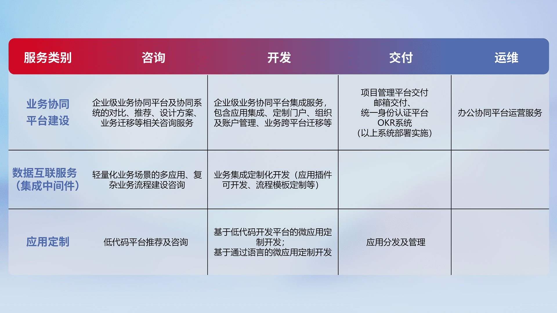 针对钉钉、、企微、、、、IDaas等平台级产品提供产品的规划、、、、方案、、、交付、、、、定制化开发等服务,,,实现如统一协同办公、、、智能客户服务、、、混合会议管理、、智能数据查询、、、等业务场景,,实现数字化转型。。。。